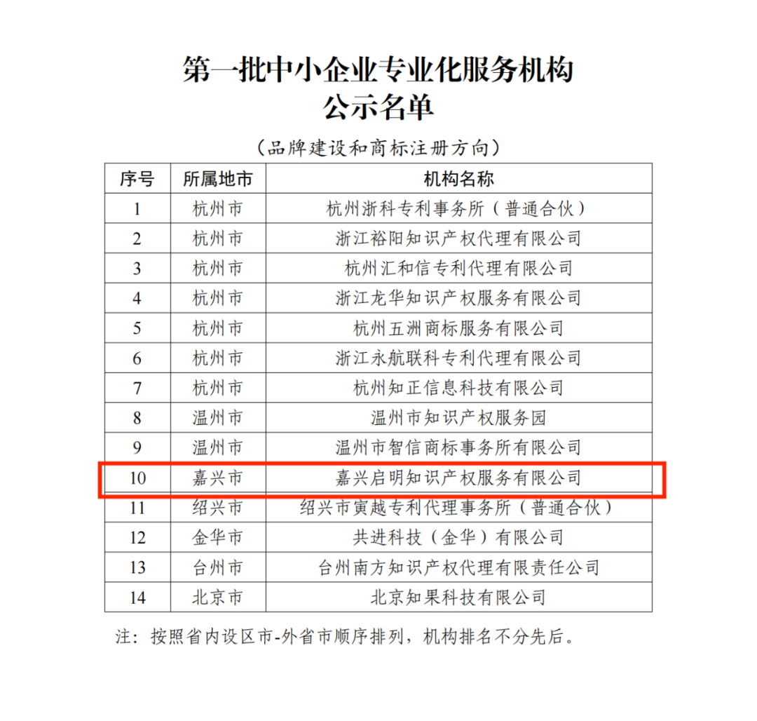 近期,浙江省經(jīng)濟(jì)和信息化廳開展全省第一批中小企業(yè)專業(yè)化服務(wù)機構(gòu)評選,我司作為知識產(chǎn)權(quán)領(lǐng)域嘉興地區(qū)唯一入選單位,獲評“浙江省第一批中小企業(yè)專業(yè)化服務(wù)機構(gòu)”。