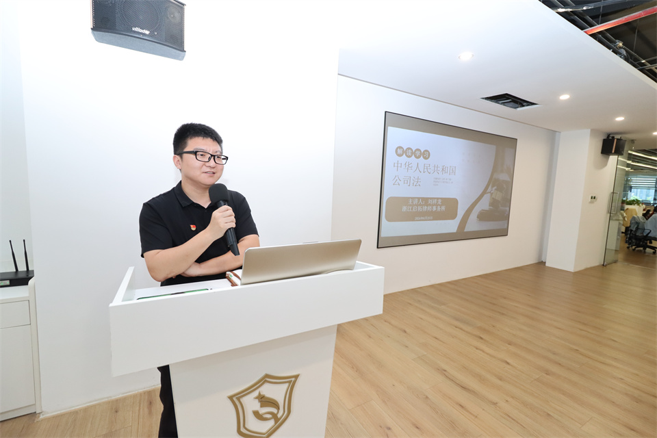 培訓會上,我司法務總監(jiān)、浙江啟拓律師事務所主任劉祥龍,從《公司法》的制定及歷次修訂背景入手,介紹《公司法》歷次修訂的主要內容變化,進而解析本次修訂要點,分析對企業(yè)的影響和應對思路,并進行風險防控提示,助力會員企業(yè)更好的懂法用法,建立更加科學、規(guī)范、有效的治理結構和更加完善的法治體系,促進企業(yè)可持續(xù)健康發(fā)展。