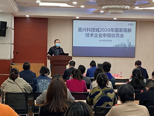 2020年3月19日,嘉興科技城組織召開2020年國家高新技術企業(yè)申報動員會,我司總經理沈杰受邀出席并做專題講座??萍汲?/span>200多名企業(yè)代表參加了本次動員大會。